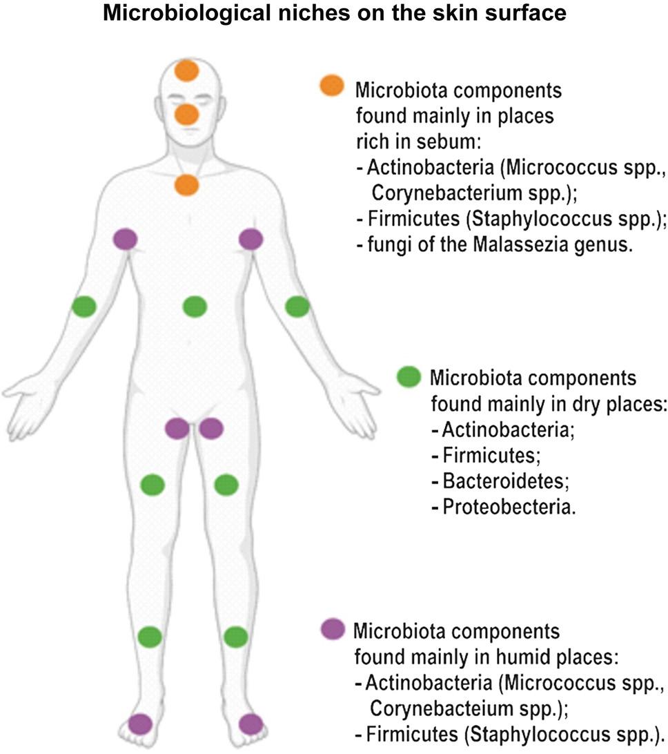 The number of microorganisms in the skin of a healthy person is 104–105 cfu/cm2. There are four main types of bacteria inhabiting human skin: Actinobacteria (Corynebacterium spp, Cutibacterium spp., Microbacterium spp., Micrococcus spp.), Firmicutes (non-hemolytic aerobic and anaerobic staphylococci (Staphylococcus spp.), Clostridium spp, a-hemolytic streptococci (Streptococcus spp.) and enterococci (Enterococcus), Bacteroidetes (Sphingobacterium spp., Chryseobacterium spp.) and Proteobacteria (Janthinobacterium spp., Serratia spp., Halomonas spp., Delftia spp., Comamonas spp.) (Cogen et al., 2008; Sanford and Gallo, 2013; Scharschmidt and Fischbach, 2013; Schommer and Gallo, 2013; Wang et al., 2014; Dreno et al., 2017; Prescott et al., 2017; Condrò et al., 2022). In a healthy human, the natural skin microbiota can be divided into permanent (renewable) and transient (temporary) (Omer et al., 2017). The permanent microbiota includes Gram-positive bacteria, mainly coagulase-negative staphylococci – Staphylococcus epidermidis (estimated to account for 50% of the bacteria residing on the skin and inhabiting the higher areas of the hair follicle mouths) and Streptococcus spp. and Enterococcus spp. and Gram-positive bacilli Corynebacterium spp. (mainly C. jeikeium), Brevibacterium spp., Cutibacterium acnes (Cogen et al., 2008; Dréno et al., 2018; Claudel et al., 2019; Xu and Li, 2019; Brown and Horswill, 2020; Flowers and Grice, 2020). The skin surface also hosts S. saprophyticus, S. hominis, S. warneri, S. haemolyticus, and S. capitis (Dreno et al., 2017). Bacteria of the genus Micrococcus are also isolated from the skin surface, most notably M. luteus and the less abundant M. varians, M. lylae, M. sedentarius, M. roseus, M. kristinae and M. nishinomiyaensis (Carmona-Cruz et al., 2022). These bacteria belong to symbiotic species and are the most stable part of the skin microbiome (Grice et al., 2008; Sanford and Gallo, 2013; Belkaid and Segre, 2014; Sanmiguel and Grice, 2015; Adamczyk et al., 2018; Lee et al., 2019; Condrò et al., 2022). Although Cutibacterium acnes is one of the main commensals of the normal bacterial biota, it also contributes to the pathogenesis of acne vulgaris (Dessinioti and Katsambas, 2017; Dréno et al., 2018). However, contrary to previous thinking, acne vulgaris is not associated with excessive proliferation of C. acnes. Present at low levels on the skin surface, C. acnes is the predominant bacterial species inhabiting sebaceous follicles (Omer et al., 2017). In contrast, studies conducted by Byrd et al. on healthy volunteers also confirm the presence of Enhydrobacter spp. and Veillonella spp. (Byrd et al., 2018). On the other hand, Myles et al. in their study focused on Gram-negative bacterial cultures and identified the following microorganisms: Roseomonas mucosa, Pseudomonas spp., Acinetobacter spp., Pantoea septica and Moraxella asloensis as commensally resident on human skin (Myles et al., 2018). Other studies have confirmed that Gram-negative bacteria, including Enterobacteriaceae, non-fermenting Gram-negative bacteria, and anaerobes, are marginal. Still, commensal organisms are also part of the transient fraction of the skin microbiota. The permanent skin microbiota also includes Micrococcus luteus, Staphylococcus aureus, Candida spp. Micrococcus and Staphylococcus bacteria habitually colonize the surfaces of the stratum corneum, while aerobic and anaerobic lipophilic tentacles abundantly colonize the deeper parts of the hair follicles and sebaceous glands (Myles et al., 2018; Boxberger et al., 2021). The secretion of skin glands modifies the composition of the solid microbiota, the way of dressing, or the vicinity of mucous membranes (Adamczyk et al., 2018; Prast-Nielsen et al., 2019; Carmona-Cruz et al., 2022). Corynebacterium, Micrococcus, Cutibacterium (formerly Propionibacterium) microorganisms are classified as Actinobacteria, which are Gram-positive microorganisms that produce numerous antibiotics (Scharschmidt and Fischbach, 2013; Condrò et al., 2022). Actinobacteria account for 51.8% of all isolated microorganisms from human skin (Schommer and Gallo, 2013; Lee et al., 2019). They are observed on the skin of the face, including the ears and nose, on the neck, back, lower abdomen, and feet. Fungi of the genus Malassezia quantitatively account for about 80% of all fungi described on human skin, but their number depends on the anatomical location of the human body (Prohic et al., 2016; Adamczyk et al., 2018; Claudel et al., 2019; Xu and Li, 2019; Carmona-Cruz et al., 2022). Fungi also include the Candida albicans, but also Rhodotorula rubra, Trichosporon cutaneum, Aspergillus spp., Penicillium spp., Rhizopus spp., Microsporum gypseum. These organisms are considered symbiotically mutualistic or commensals, i.e., organisms that do not harm the human organism and even benefit it (Adamczyk et al., 2018). Their very presence limits the growth of other (often harmful) organisms by competing with them (Grice et al., 2008; Sanmiguel and Grice, 2015). The transient microbiota is periodically variable and associated with continuous exposure and direct contact of the skin with the external environment (it can come from other people, animals, or the environment).