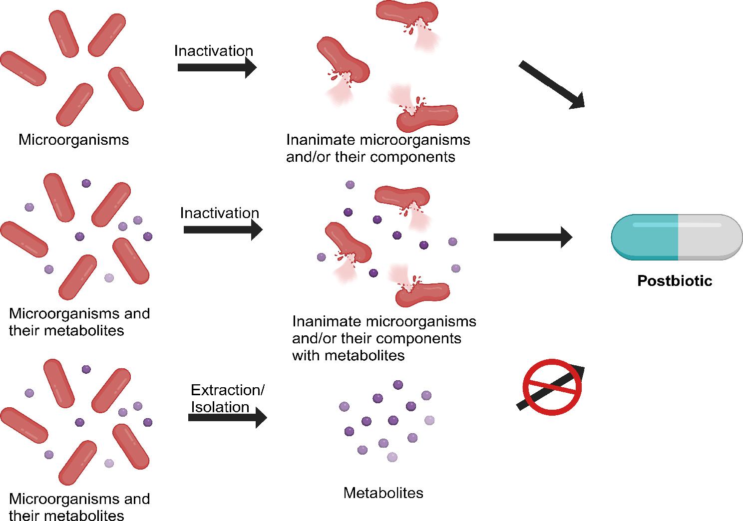 Probiotics, in addition to mandatory presence of live microorganism, naturally contain dead cells. For a long time, the influence of dead microorganisms in probiotics has been overlooked. Since the potential of inanimate cells to confer a health benefit in host has been recognized, multiple names to describe such preparations have emerged in the literature. Examples include: ‘heat-killed probiotics’, ‘paraprobiotics’, ‘tyndallized probiotics’ and ‘postbiotics’ (Barros et al. 2021; Ding et al. 2021; Boyte et al. 2023; Bolzon et al. 2024). In 2019, ISAPP reviewed existing names describing preparations containing dead microorganism cells and, two years later, published the consensus statement on the definition of postbiotics: “preparation of inanimate microorganisms and/or their components that confers a health benefit on the host” (Salminen et al., 2021).