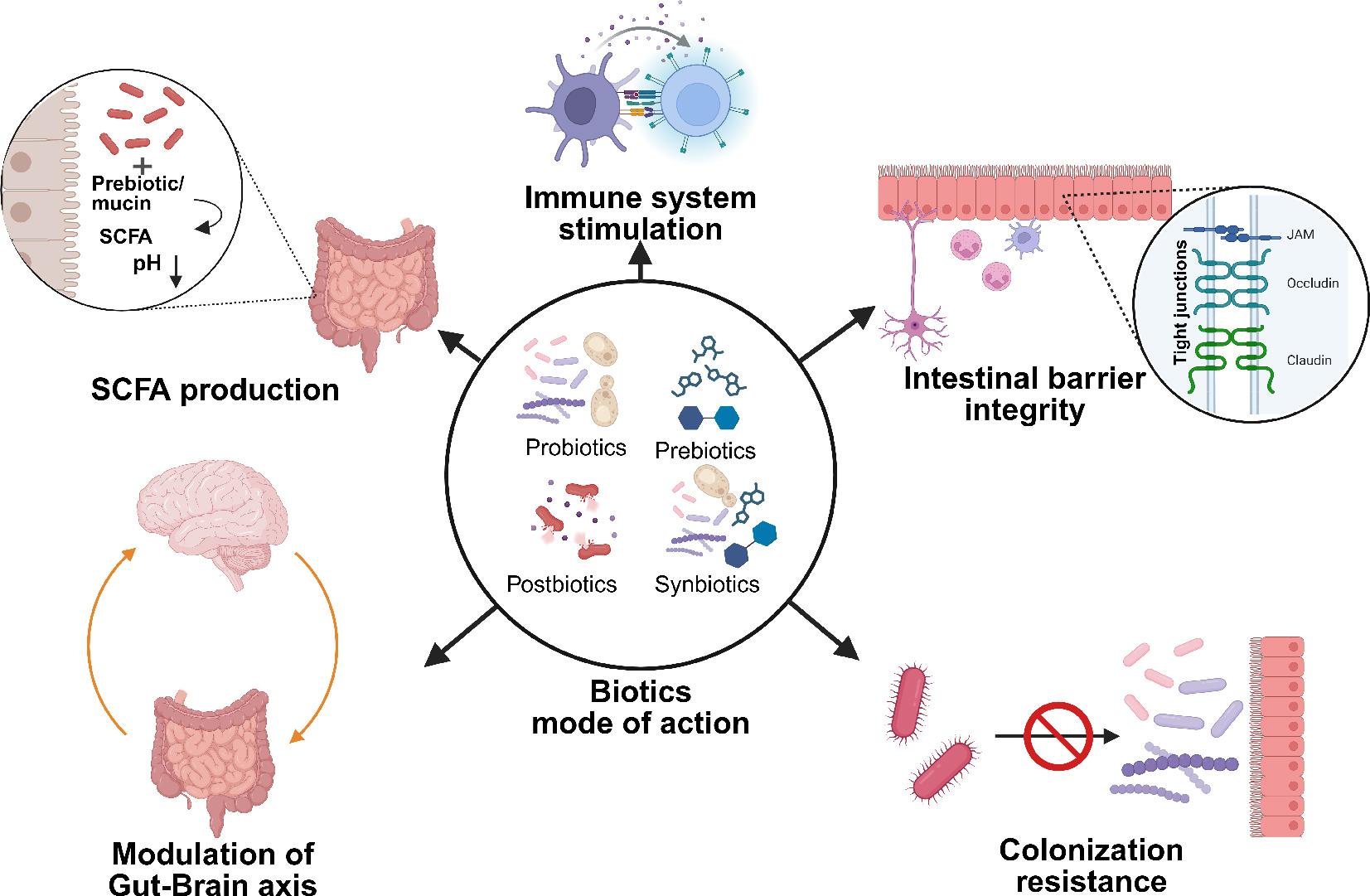 The integrity of intestinal barrier is another very important aspect, which can be positively affected by biotics. In health, properly functioning barrier prevents the pathogens from penetrating the intestine wall and entering other body sites. Biotic administration, such as synbiotics, can enhance the integrity of the barrier by decreasing the level of pro-inflammatory biomarkers and increasing anti-inflammatory cytokines (Li et al. 2023). Mucin layer present in intestines prevents the direct contact of microorganisms with epithelial cells (Di Tommaso et al. 2021). Lack or thinning of this layer, observed in diseases e.g. inflammatory bowel disease (IBD), leads to constant stimulation of immune system as epithelial cells are directly exposed to microbial antigens. As a result, inflammation is observed and the integrity of the intestinal barrier is disrupted (Aleman et al. 2023). Mucin degradation is generally considered as a pathogenicity factor, but probiotic microorganism can use this ability to set an equilibrium between the mucin degradation and host production of mucin (Markowska and Kiersztan 2021). Products of mucin degradation, such as SCFA, can be beneficial to host. SCFA promote the tight junction formation, directly affecting the integrity of intestinal barrier (Hays et al. 2024). Constant immune system interactions with multiple microbial antigens, due to a disrupted intestinal barrier, negatively affect the host and can lead to diseases such as leaky gut syndrome (Chae et al. 2024). However, the interactions between the immune system and microorganisms are not always unfavourable. Postbiotic preparations can positively affect the activity of immune cells, thereby boosting host immunity (Kato et al. 2024).