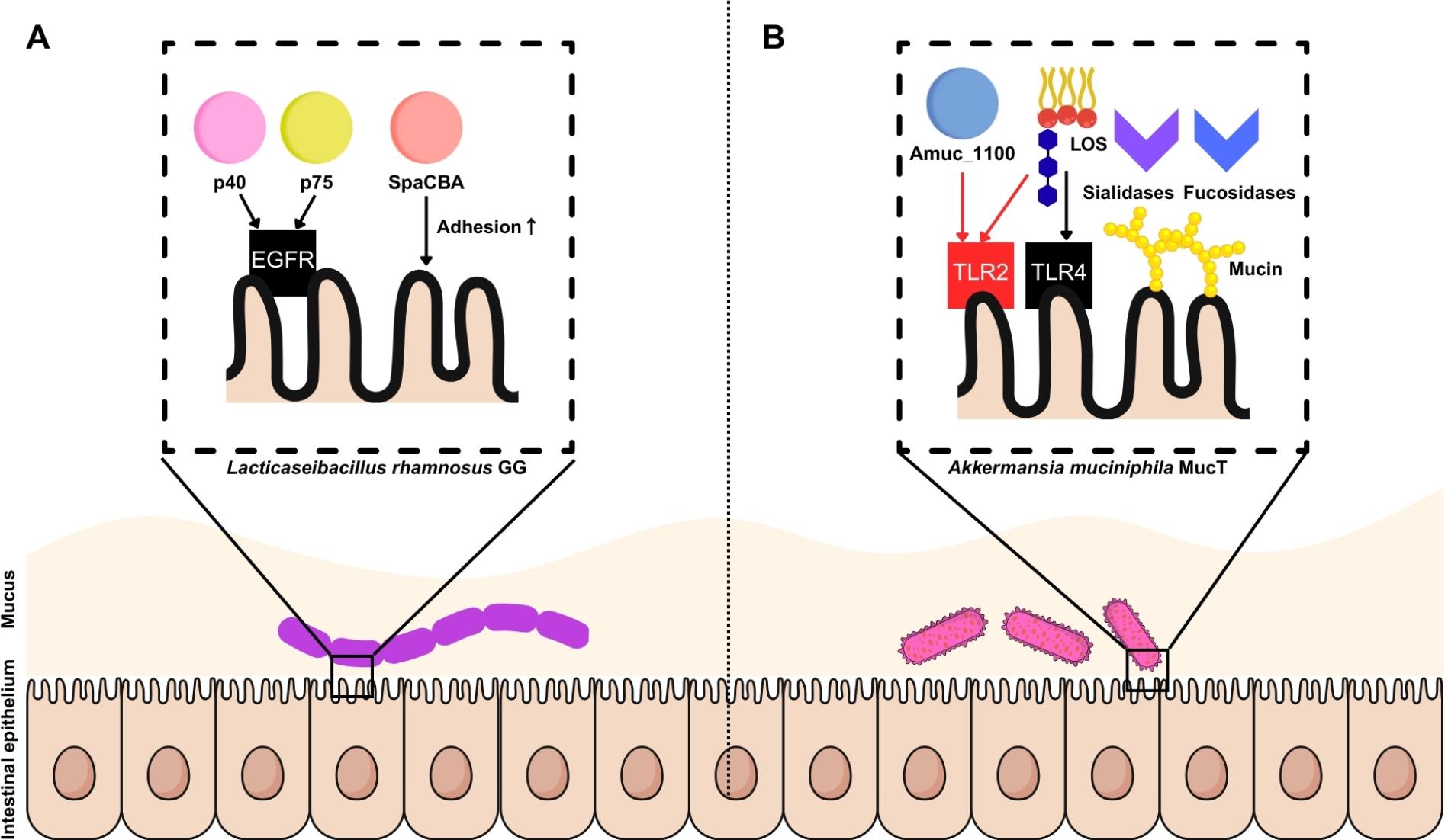 Selected molecular mechanisms by which two probiotic strains, A - Lacticaseibacillus rhamnosus GG and B –Akkermansia muciniphila MucT, interact with host intestinal epithelium. Panel A illustrates L. rhamnosus GG indirect interactions mediated by p40 and p75, which interact with EGFR, as well as direct interactions induced by SpaCBA. Panel B illustrates A. muciniphila MucT direct and indirect interactions, the former shown as Amuc_1100 and LOS interactions with TLR2 and TLR4, the latter as sialidases and fucosidases degrading mucin.