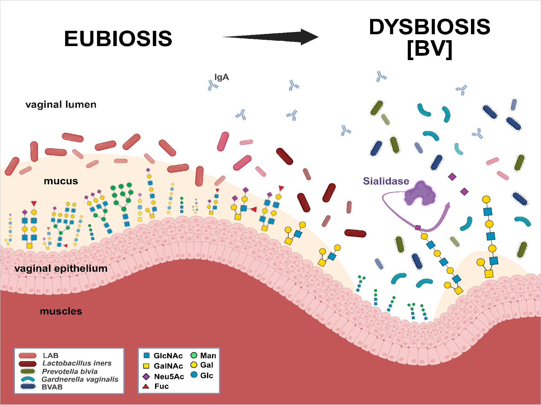 Bacterial overgrowth in BV is associated with the production of many virulence factors, including glycosidases (e.g., sialidases), proteases, and sulfatases. Bacterial enzymes modify host molecules and alter the local environment to support microbial survival and interaction with host tissues. Through these activities, they contribute to processes such as nutrient acquisition, tissue remodeling, and modulation of immune responses. Glycosidase activity alters the sugar composition of glycoproteins. As a result, in dysbiosis, the glycan composition of the vaginal mucosa and secreted fluid differs from that in eubiosis (Bonnardel et al. 2021).
