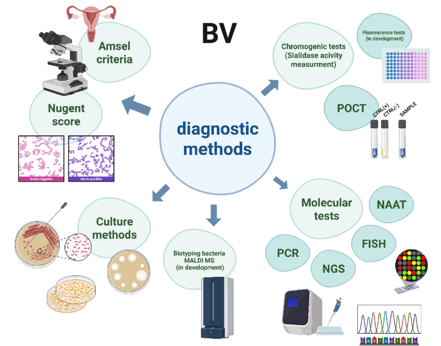 Overview of bacterial vaginosis diagnosis. Own graphic design using Biorender software (https://BioRender.com/entt8c0).