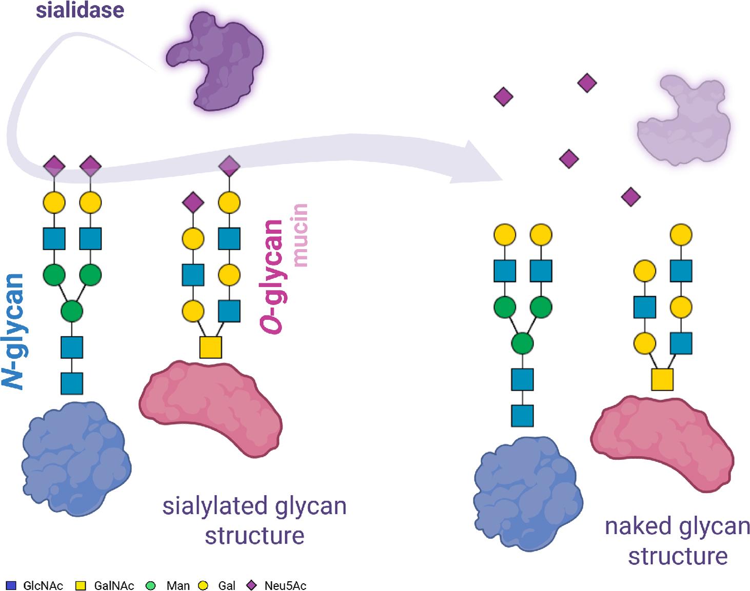 Sialidase mechanism of action. Own graphic design according to Biorender software (https://biorender.com/97qvka8).