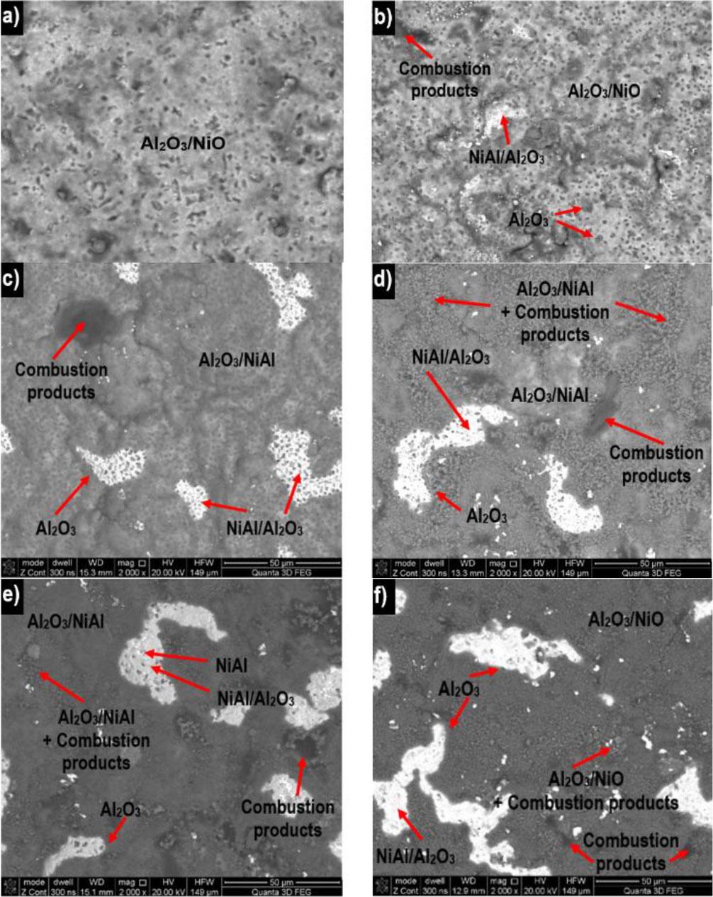 Changes in the content of individual elements also translate to phase changes. They are particularly emphasized if we analyse the impact of temperature on the percentage content share of oxides on the surface of tested blades (Fig. 14). Based on the obtained data, it can be clearly seen that with increasing temperature, the mass oxide share reaches its maximum for a blade heated at 1423 K. In this case, the total oxide share exceeds 50% of the weight content. Furthermore, the recorded changes in oxide share directly translate to changes in their type. The impact of temperature on nickel oxide share changes is particularly noticeable in this case (Fig. 15). NiO content share changes impacted by temperature are primarily associated with the creation of the Al2O3 scale on the surface of the analysed blades.