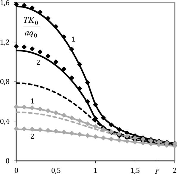 Figure 3 show the distributions of the temperature over the surface of the inhomogeneous half-space z = h (black lines and rhombi) and over the interface between coating and base z = 0 (grey lines and rhombi) for two values of the parameter κ2.