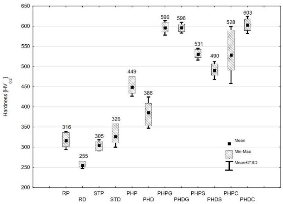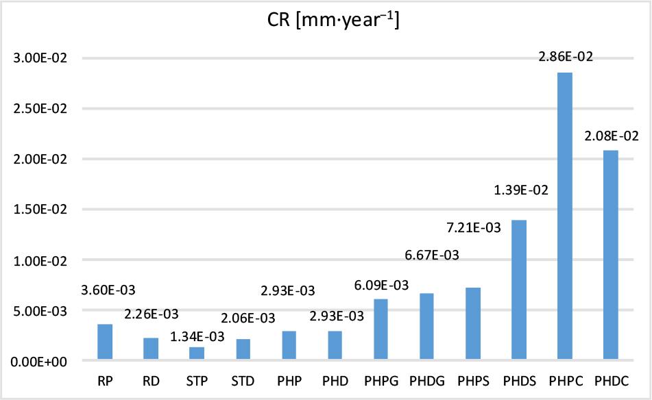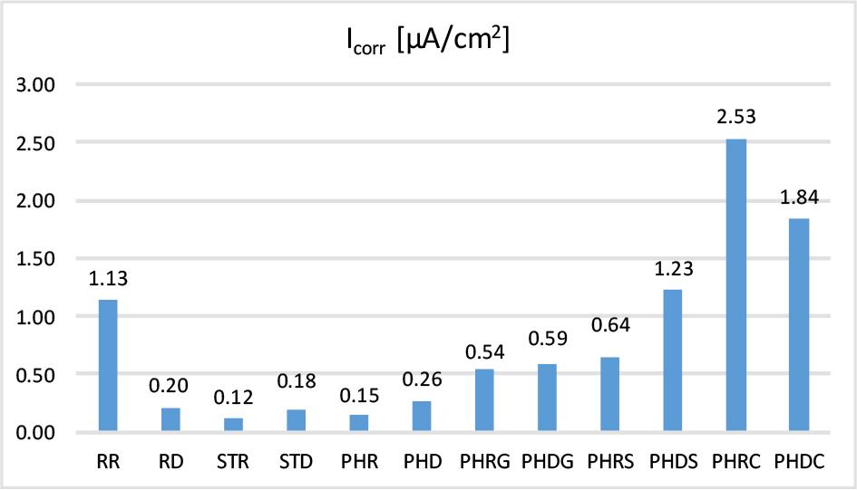 As previously noted, corrosion resistance in this case study results from the three main factors of grain size, chemical and phase composition and development, and, therefore, surface roughness. A link was noted between roughness and corrosion current density, which can be identified as a decisive parameter giving information on corrosion resistance. In the analysed case, the best coefficient for assessing corrosion resistance is CR (see Fig. 14) directly related to Icorr (Corrosion current density). In the case of the RP to PHD specimens, disregarding the STD with obtained a low roughness after surface grinding. However, the STD sample deviates slightly, and this translates into a significantly worse corrosion resistance. In the case of the RP sample, the influence of the microstructure is mainly visible, compared to the rest of the samples it is a material that has not been heat treated or mechanically processed.