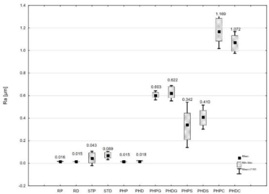 Significantly lower roughness was achieved when compared to 17-4PH DMLS steel without preparation by grinding that achieved Ra 4.5-5.5 μm, Rq 5.8-7 μm, Rt 22-28 μm some differences can be noted [8]. Similar condition Ra 5.04±0.56 μm for reference material, for SP with steel shots Ra 5.71±0.26 μm and 4.39±1.43 μm for ceramic is described in [25].