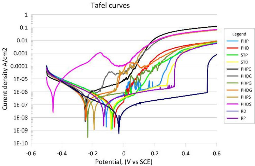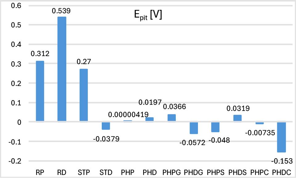 An important parameter in the context of corrosion protection is Epit (see Fig. 13). The highest Epit value and at the same time the most favourable one was RD (0.539 V). The lowest Epit value and, at the same time, the material with the greatest potential for pitting corrosion was PHDC (-0.153 V). As can be seen in Fig. 13, there is a visible decrease in pitting corrosion resistance after the precipitation hardening process. However, it is not possible to clearly indicate whether conventional steel or DMLS is more resistant. In the group of materials that underwent SP, the highest Epit value was found in PHPG (0.0366 V).