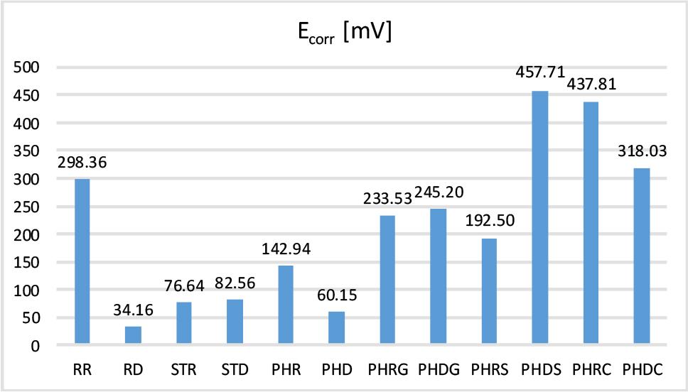 In addition, it differs from the DMLS-made material in terms of its thermal history, as compared to the DMLS reference material it was only heated once while the RD went through a cycle of remelting and sintering successive layers while heating the material around it. The corrosion resistance of the glass-peened materials (PHRG and PHDG) is also related to the roughness. An increase in roughness resulted in a decrease in corrosion resistance in this group and a slight difference between the PHRG and PHDG samples tested was also evident in the Icorr parameter (see Fig. 11). Its increase led to a decrease in corrosion resistance in this group and a slight difference between the PHRG and PHDG samples tested was also seen in the Icorr parameter. The situation is similar for the next group of steel specimens, but in this case, the effect of the medium on the corrosion resistance is also shown by the present and previous studies and the model proposed by Kameyama and Komotori [26]. While the presence of steel particles located on the surface is sometimes difficult to confirm using, for example, EDS, the presence of glass and ceramic particles is easy to verify. Again, however, the difference between PHRS and PHDS is apparent due to the small difference in roughness. Reference specimen made using DMLS was characterised by smallest Ecorr on the other hand the highest Ecorr was observed for PHDS. As can be seen corrosion potential seam to generally lower after treatment for conventional material and increase for DMSL (see Fig. 12). Discontinuities or irregularities in the surface resulting from SP indentations cause local variations in surface morphology and roughness.Differences in the Ecorr can be correlated to spots where corrosion attack start to create usually in the top of SP inducted dents [27].