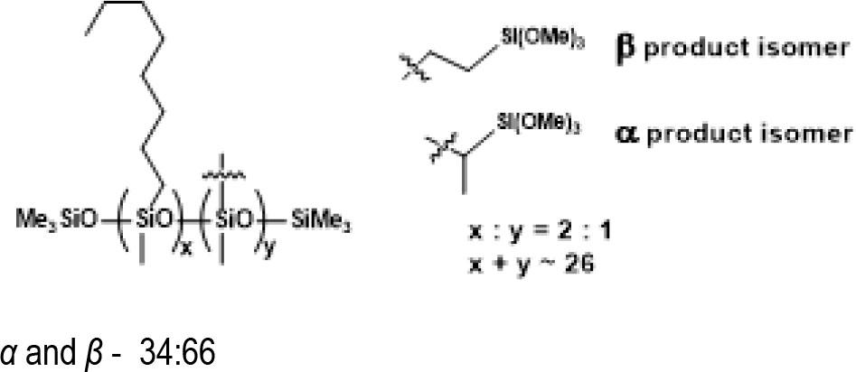 1H NMR (400 MHz, CDCl3): δ (ppm) = 3.56 (s, OMe), 1.30-1.27 (m, octyl -CH2-), 1.09 (d, J=7.5Hz, α trimethylsiloxy), 0.88 (t, J=6.2Hz, octyl -CH3), 0.61-0.50 (m, SiCH2-, SiCH(CH3)Si), 0.14, 0.08, 0.07, 0.04 (s, SiMe2, SiMe3);