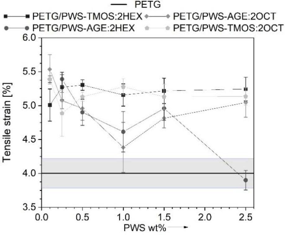 Tensile strain (elongation at tensile strength) of PET-G and its composites as a function of polysiloxane-based modifier share
