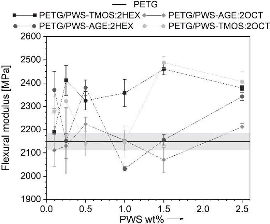 Flexural modulus of PET-G and its composites as a function of polysiloxane-based modifier share