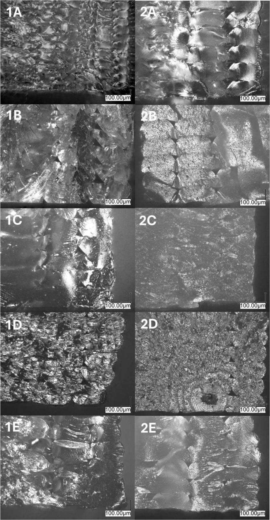 Microscopic photos of sample fractures: 1A-2A Reference; 1B- 0.1%, 2B- 2.5% - PETG/PWS-AGE:2HEX; 1C- 0.1%, 2C- 2.5% - PETG/PWS-AGE:2OCT; 1D- 0.1%, 2D- 2.5% - PETG/PWS-TMOS:2OCT; 1E- 0.1%, 2E- 2.5% PETG/PWS-TMOS:2HEX