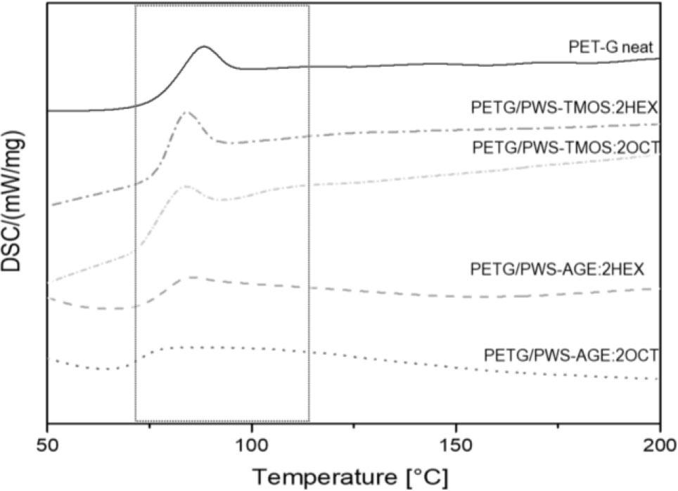 Figure 12 shows the results of differential scanning calorimetry (DSC) in inert gas flow. Neat PET-G and composite samples containing 2.5% modifier content were analyzed. The DSC curves (seen in Fig. 12) show only one endothermic peak in each sample, which corresponds to the glass transition temperature (Tg). PET-G belongs to amorphous polymers, therefore other transitions such as crystallization or melting are not observed. The unmodified sample has the highest glass transition temperature Tg = 86.3°C (Tab. 4). Organosilicon modifiers may have a plasticizing effect in polymer systems, which results in a lower glass transition temperature. The PETG/PWS-AGE:2OCT sample has the lowest Tg value. Glycidyl groups present in the modifier molecule affect the amorphization of the matrix material, which is also visible by changing the course of the DSC curve, for both PETG/PWS-AGE:2OCT and PETG/PWS-AGE:2HEX composite systems [23].