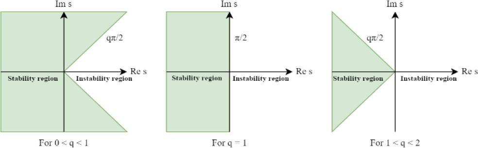 The general structure of FOPID Controller corresponding to eq. (3.1) is shown on Figure 3.1, where E(s) is control error and U(s) is controller output. In special circumstances PIλDμ controller can be equal to the classic PID Controller, for example if λ = 1 and μ = 0, then eq. (3.1) will describe PI controller as shown in Figure 3.2. The controller plane for FOPID has to be divided into two areas: A when 0 < λ, μ ⩽ 1 and B when 1 < λ, μ ⩽ 2. This is due to the stability conditions [16] of the system depending on the value of the controller order. In Figure 3.3, where q corresponds to fractional operator order, stability regions are depicted for the controller order corresponding to the zones separated in Figure 3.2. It is worth mentioning that using λ, μ > 2 will result in controllers instability.