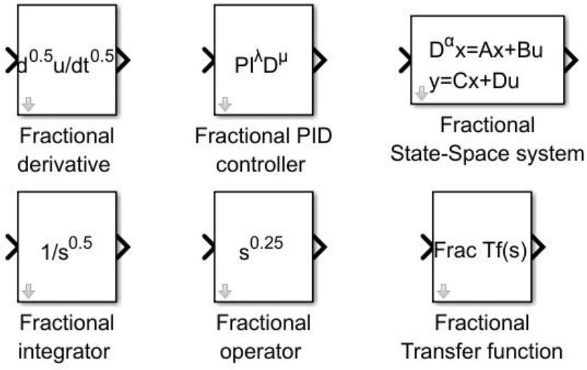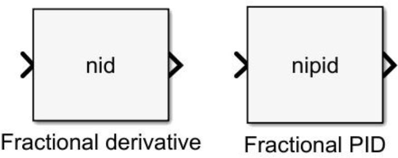 The Ninteger toolbox has a wide range of available functions with focus on CRONE Controllers and approximations but comes with only two universal block structures: Fractional derivative and FOPID controller. Figures 4.1, 4.2 and 4.3 show examples of universal blocks from the mentioned toolboxes. Those toolboxes are also suitable for hardware implementation.
