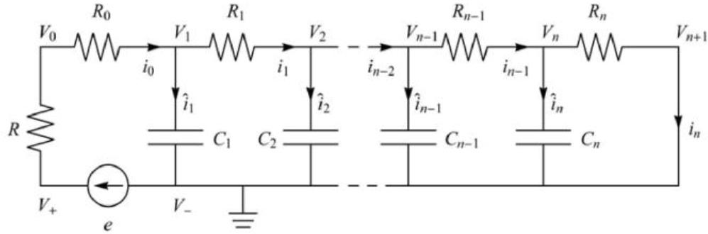 A device demonstrating behavior governed by fractional-order dynamics is termed a fractance [34, 35]. The fractance devices can be classified by three basic types: domino ladder circuit network, a tree structure of electrical elements and net-grid network. Each is built with infinitely many resistors R and capacitors C connected in series or parallel. As part of the study, it was decided to consider the case of a domino ladder system described as a Cauer type I structure, shown in Figure 5.1. Since there is no phenomenon of infinity in reality, a fractance with dynamics corresponding to a non-integer order α system, can be approximated by finite number of elements using truncated continued fraction expansion (CFE). Using the aforementioned CFE method, the impedance of domino ladder system can be described as: [34]