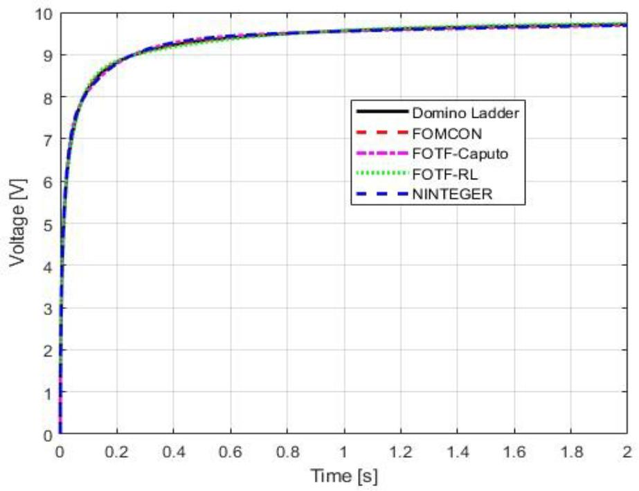 Using eq. (5.6) and FOMCON, FOTF and NINTEGER Toolboxes several models were created with approximation order of 5 and frequency range [0.001;1000]. All of the considered models were then supplied with a voltage step signal of 10 V and their response was compared with domino ladder system response. This step is essential to verify that all fractional integrators provided by the toolboxes perform as expected and to identify the most suitable implementation before applying them in control scenarios. The responses of those models are shown in Figure 6.2, where the difference between them is apparent, but appears to be insignificant.