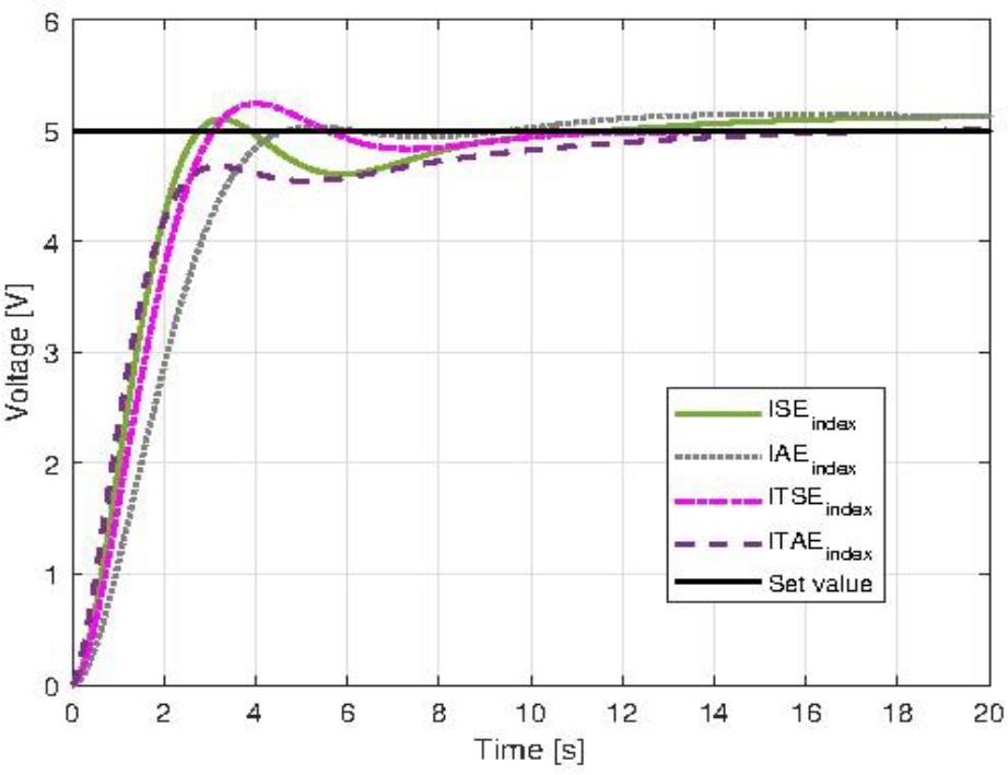 The last approach presented in [18] focuses on solely optimization algorithms. The authors considered BLDC (brushless direct-current) motor as a control plant and used PID and FOPID controller tuned with multiple different methods to test the performance of such system. They used genetic algorithm, fuzzy logic, Grey Wolf Algorithm, Artificial bee colony algorithm, Neural-networks and more, with all of them using the same conditions and cost functions. The most popular cost functions are defined with integral indexes, for example, Integral Absolute Error (IAE), Integral of Time Multiplied Squared Error (ITSE), Integral of Time Multiplied Absolute Error (ITAE). Each algorithm generated a certain controller set vector and then determined the value of the cost function, which it minimized at the next iteration. The main difference between the aforementioned solutions was the difference in the operation of the algorithm’s core, which handled the generation and updating of new set vectors. According to the results obtained by the authors, all of the considered methods can be successfully applied to determine optimal setting for controller, which proved that optimization algorithms are viable option as tuning method.