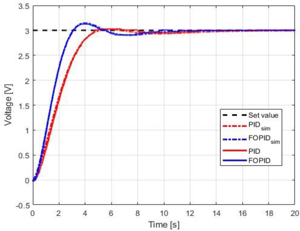 Comparison of the simulation and real control plant responses for PID and FOPID controller