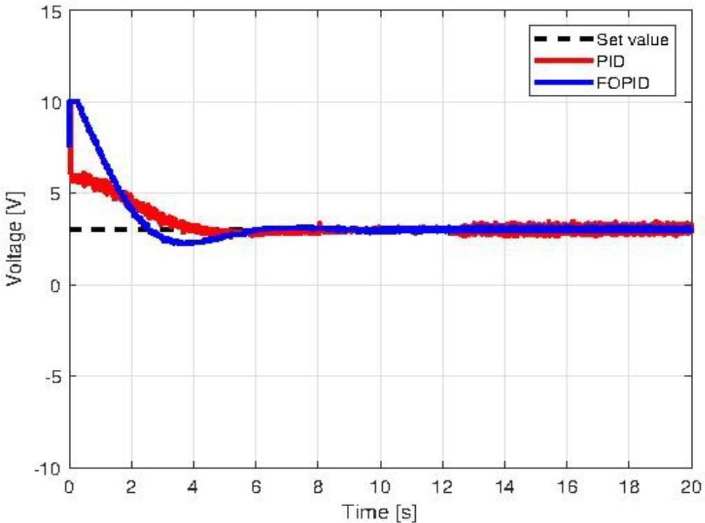 The system from section 6.2 has been implemented with a procedure from Figure 7.2. into myRIO-1900 using the PID and FOPID controller parameters optimized for the ITSE criterion. Figure 7.3 presents the closed-loop responses of both the physical plant and simulated system, while Figure 7.4 displays their corresponding control signals.
