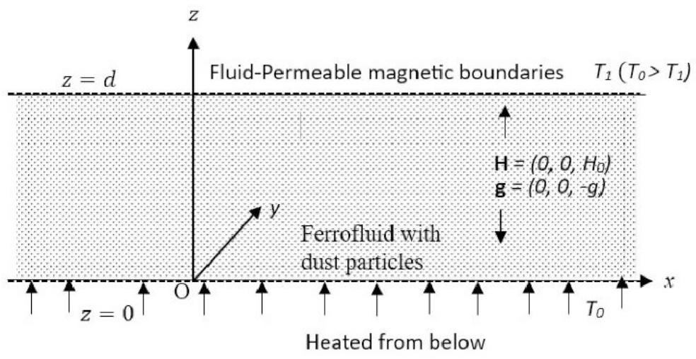 Consider a static layer of ferromagnetic fluid with a finite vertical thickness d and an infinite horizontal extent, heated from below, and containing dust particles. This fluid layer is subjected to a uniform vertical magnetic field H and experiences a gravitational force represented by and this system is confined between two horizontal fluid-permeable magnetic boundaries (as depicted in Fig. 1)
