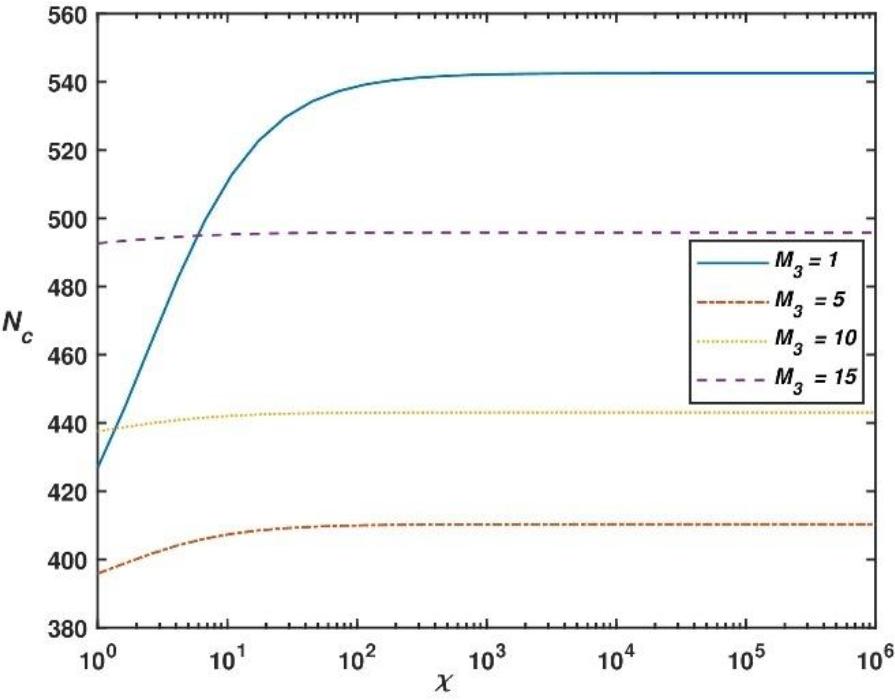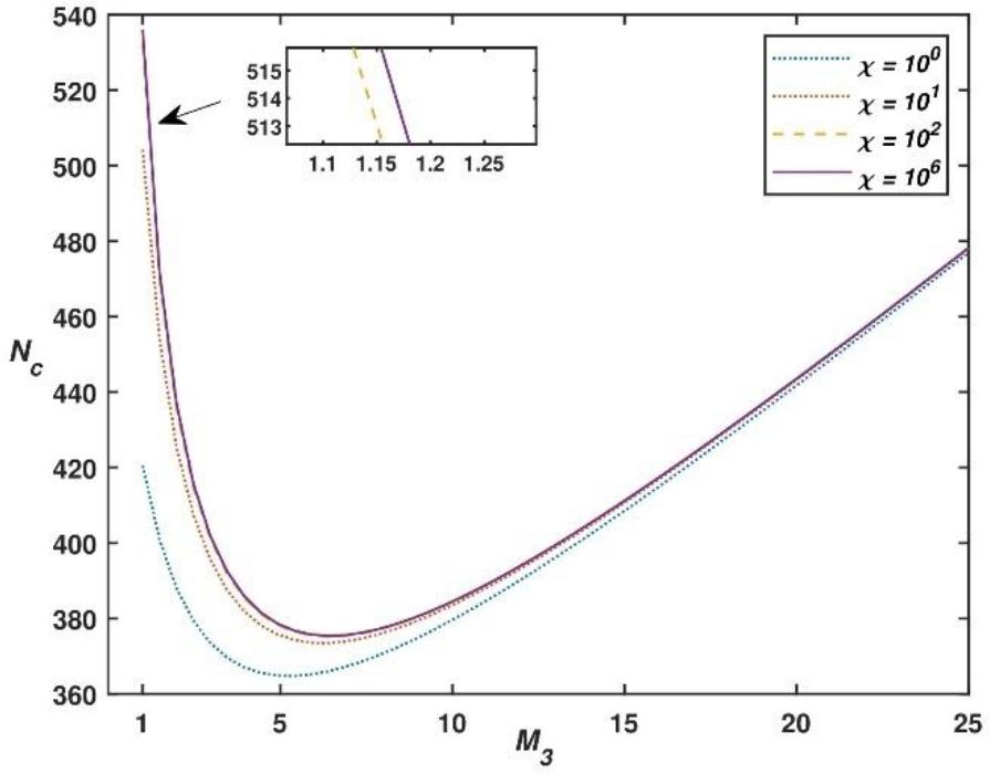Graph between Nc vs M3 at χ = 1, Das = 1 and h1 = 3
