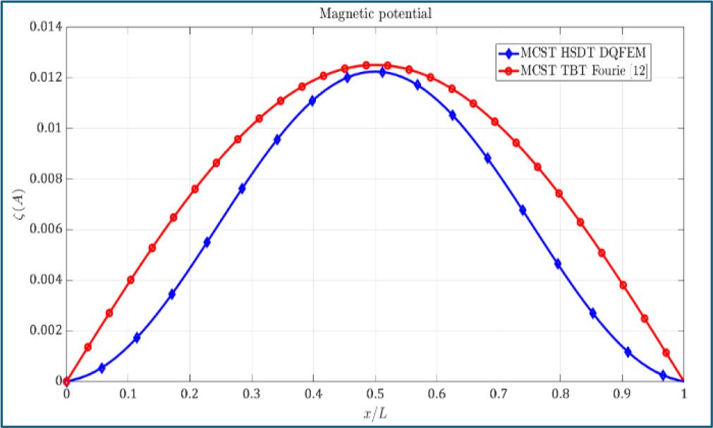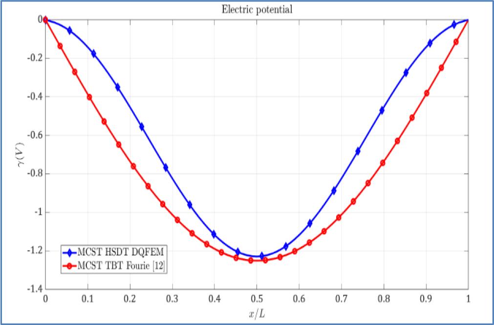To validate our model, we computed the semi-analytical model presented in reference [12] and compared it with our method. As shown in Figures 2–4, the results of our current model closely align in midspan with the semi-analytical results from [12]. Our model give the exact shape of the bending, electrical potential and magnetic potential, on the other hand the literature semi analytical model give only the sinusoidal midspan value shape. This comparison supports the validity of the existing model and demonstrates that the DQFEM, in conjunction with the refined high-order beam theory, provides more accurate results at all locations, in contrast to analytical methods, which only provide data at the midline. Table 2 presents a comparison of the first and second frequencies, as well as the midspan deflection, electric potential, and magnetic potential. The results in Table 2 further confirm the effectiveness and validity of our model.