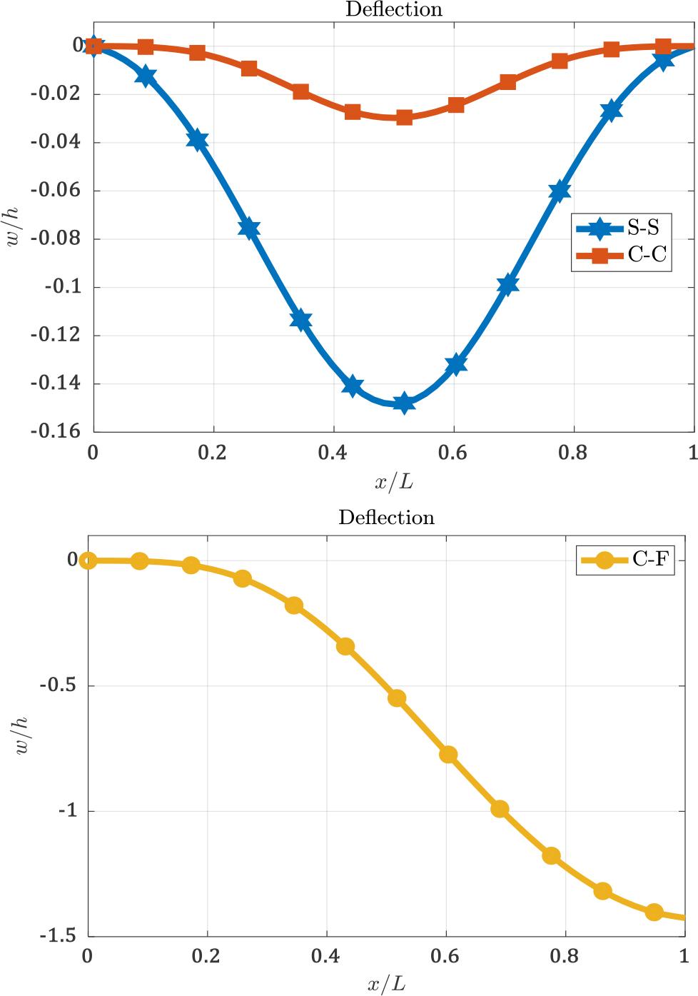 In Figure 5, we demonstrated the bending response of the magneto-electro-elastic (MEE) bilaterally supported microbeam under different boundary conditions (simply supported, clamped, and clamped-free). The observed variations in deflection arise due to differences in constraint stiffness. The simply supported beam experiences the highest deflection as it lacks rotational constraints at the ends, whereas the clamped beam exhibits reduced deflection due to restricted end rotations.