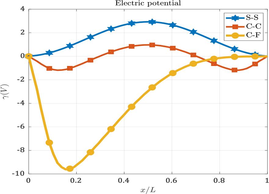 Electric potential of MEE bilaterally microbeam with various boundary conditions (kz = 1, h = 20μm, b = 2h, L = 20h, BaTiO3(50%) – CoFe2O4(50%))