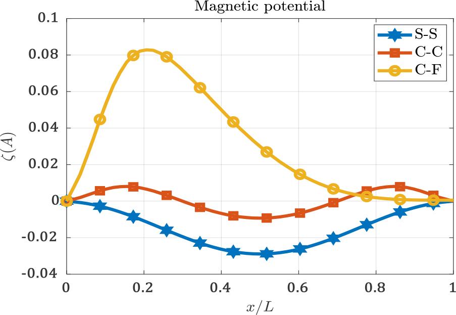 Magnetic potential of MEE bilaterally microbeam with various boundary conditions (kz = 1, h = 20μm, b = 2h, L = 20h, BaTiO3(50%) – CoFe2O4(50%))