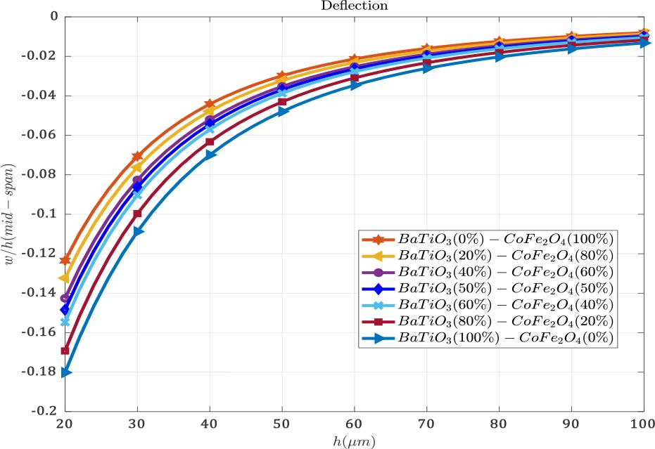 Simply supported microbeam midspan deflection with various thickness and MEE inner material mixture percentage BaTiO3 – CoFe2O4 (kz = 1, b = 2h, L = 20h,)