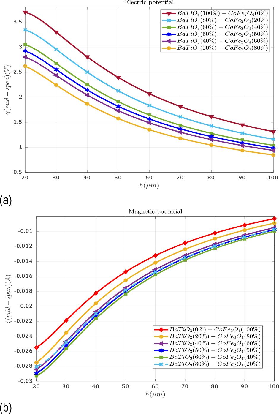 Electric (a) and magnetic (b) potentials at simply supported microbeam midspan with various thickness and MEE inner material mixture percentage BaTiO3 – CoFe2O4 (kz = 1, b = 2h, L = 20h,)
