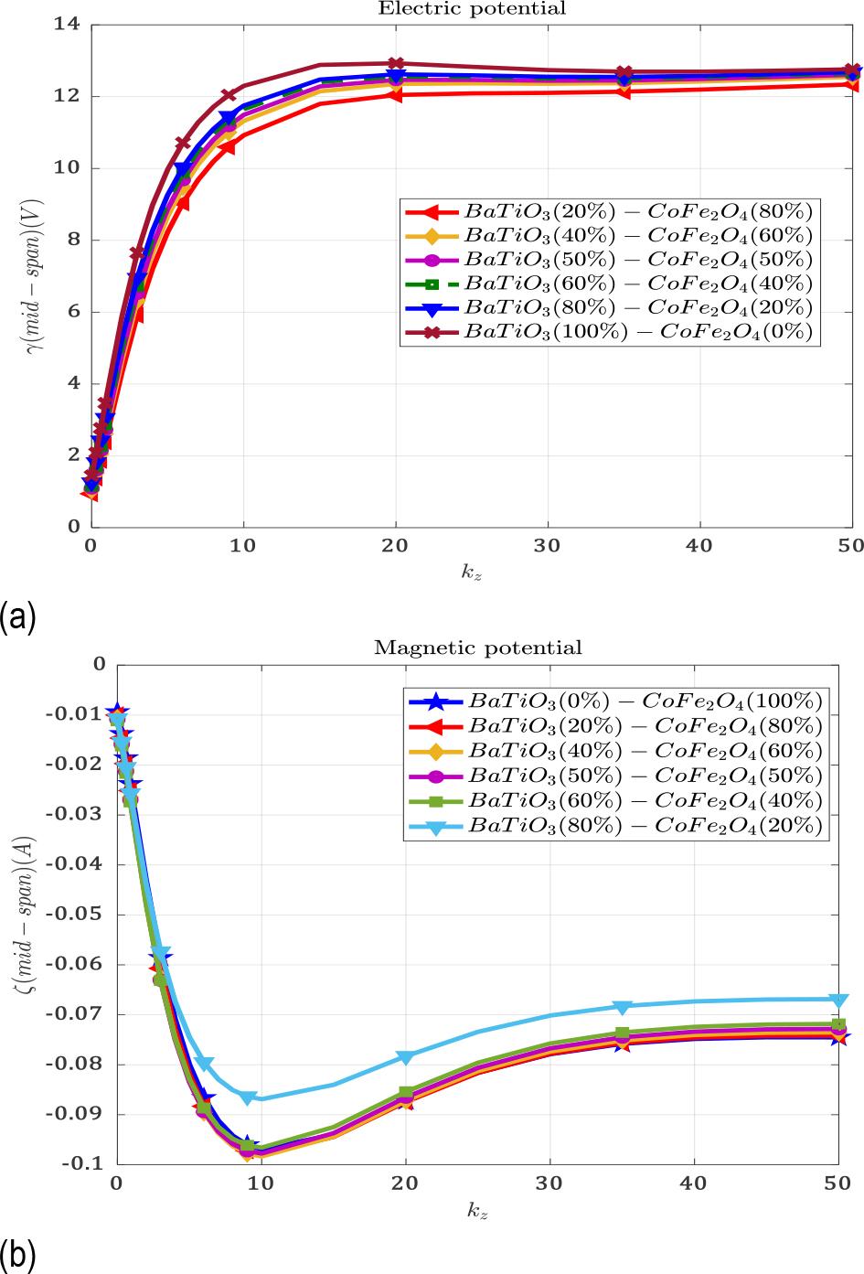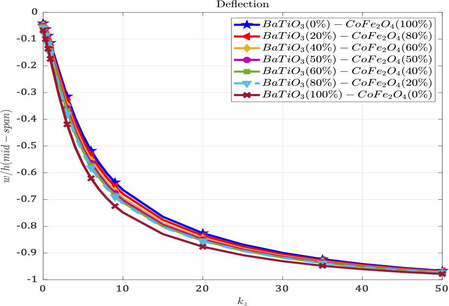 Figures 10 and 11 depict the influence of the functionally graded (FG) material gradation index on the midspan deflection and electromechanical potentials. As the gradation index kz increases, the beam composition transitions from a fully magneto-electro-elastic core (BaTiO3 – CoFe2O4) to an outer epoxy-rich composition. Given that epoxy is significantly more flexible and less dense than the ceramic phases, the beam exhibits increased deflection due to reduced overall stiffness.