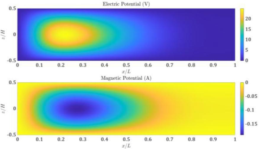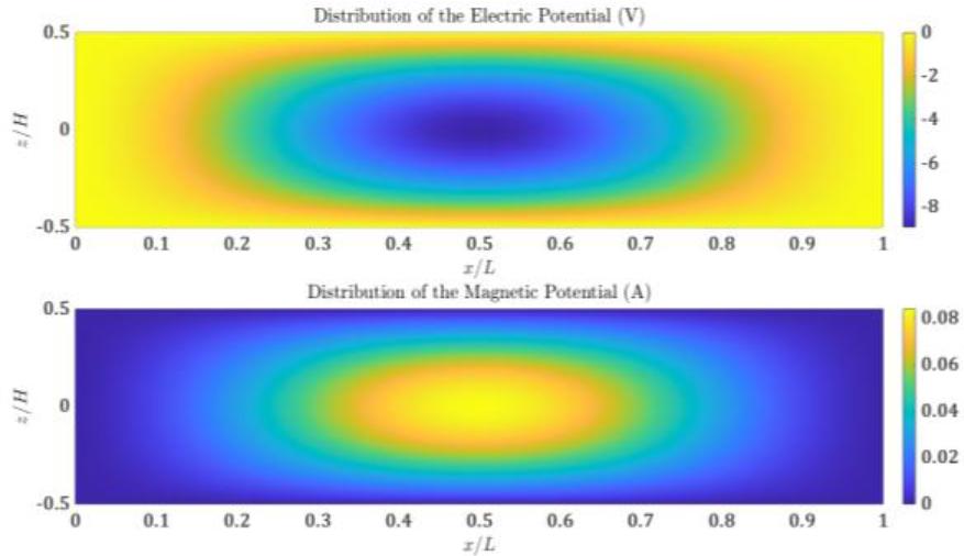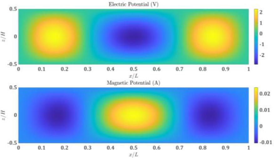 It is evident that the electric and magnetic potential distributions for the simply supported (Figure 12) and clamped (Figure 13) beams exhibit central symmetry.