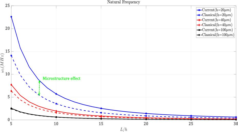 On the other hand, the natural frequencies exhibit an inverse relationship with the length-to-thickness ratio, decreasing as the microbeam becomes thinner.