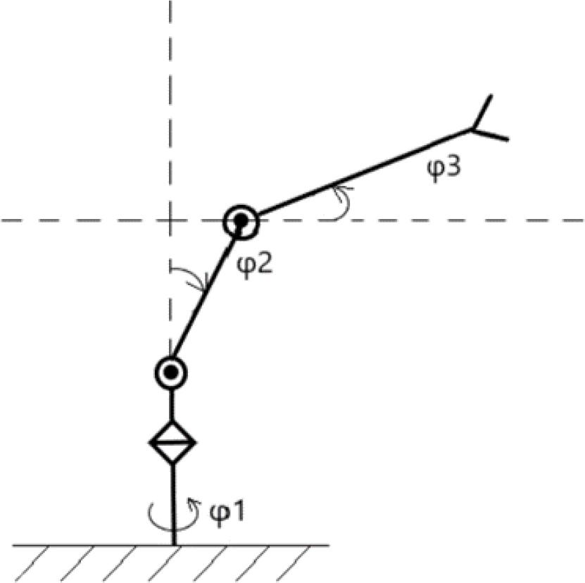 Two different manipulators were used to compare the usefulness and universality of the devel-oped control system based on serial motion kinematics. In this concept, the link with the attached force performing the kinematic transfer is a unit of motion of the kinematic set. A kinematic diagram must be defined to specify the basic position of the members, their interconnections and positions, and dimen-sional and geometric descriptions. Therefore, the manipulator structure is designed to integrate robot elements and realize the relationship between sub-assemblies for the selected system. A kinematic diagram of the compiled RRR robot is shown in Fig. 1. Each member moves along a particular axis and is connected to the rest of the system in an articulated manner. The integrated movement of each axle enables the manipulator to be controlled in the working space and realization of the assigned tasks.