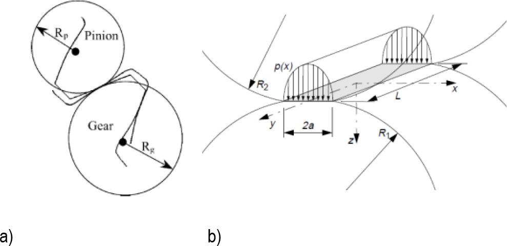 Cylinders simulate two gear teeth in an RCF test (a), and Hertzian contact between two rollers(b) [15]