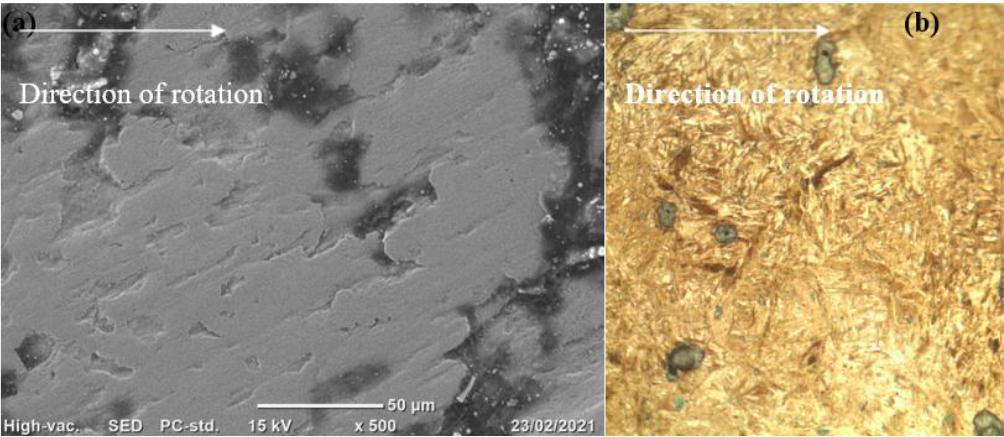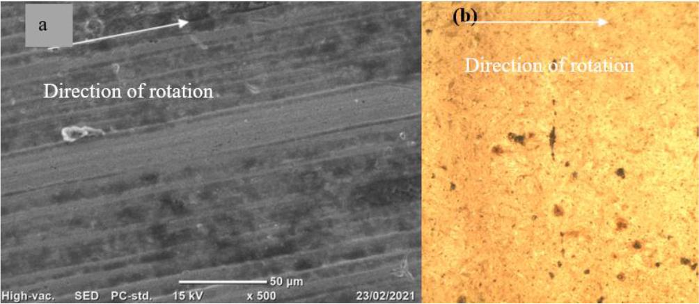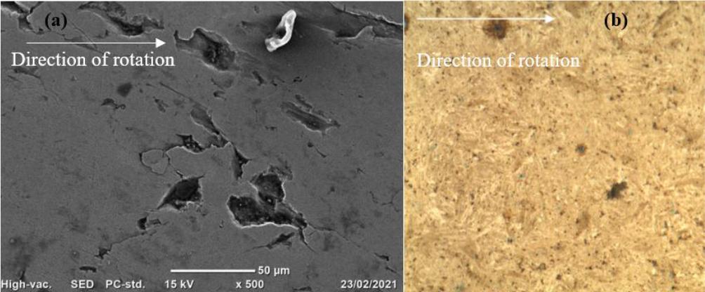 OM and SEM micrographs of the high-speed and low-speed disks of Cr-Mo and Ni-doped Cr-Mo alloy steels were displayed in Fig. 5 to 8. Among the several SEM micrographs of high-speed and low-speed discs of Cr-Mo alloy steel materials, Fig. 5 (a) & (b) and Fig. 6 (a) & (b) show SEM micrographs of 50 μm scale and 500 magnifications. It is evident from both micrographs that pits are already present. Following a run-in, mated bodies that are subjected to rolling or sliding motion experience significant plastic deformation [35, 37]. After 10 million stress cycles, the damaged area of the Cr-Mo alloy steel is visible in Fig. 5, high-speed disk micrographs. Consequently, some surface micropits are visible. The Cr-Mo alloy steel of low-speed disk SEM micrographs at about 5 million stress cycles is similarly shown in Fig. 6. When the disk is viewed under high magnification, minute pits are apparent.