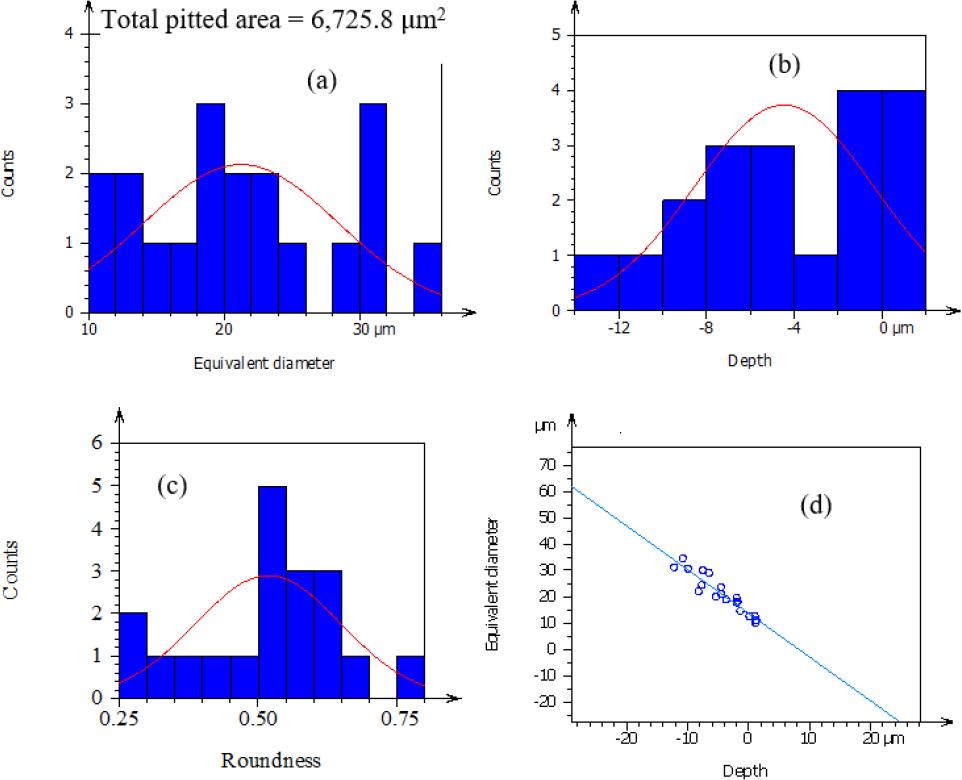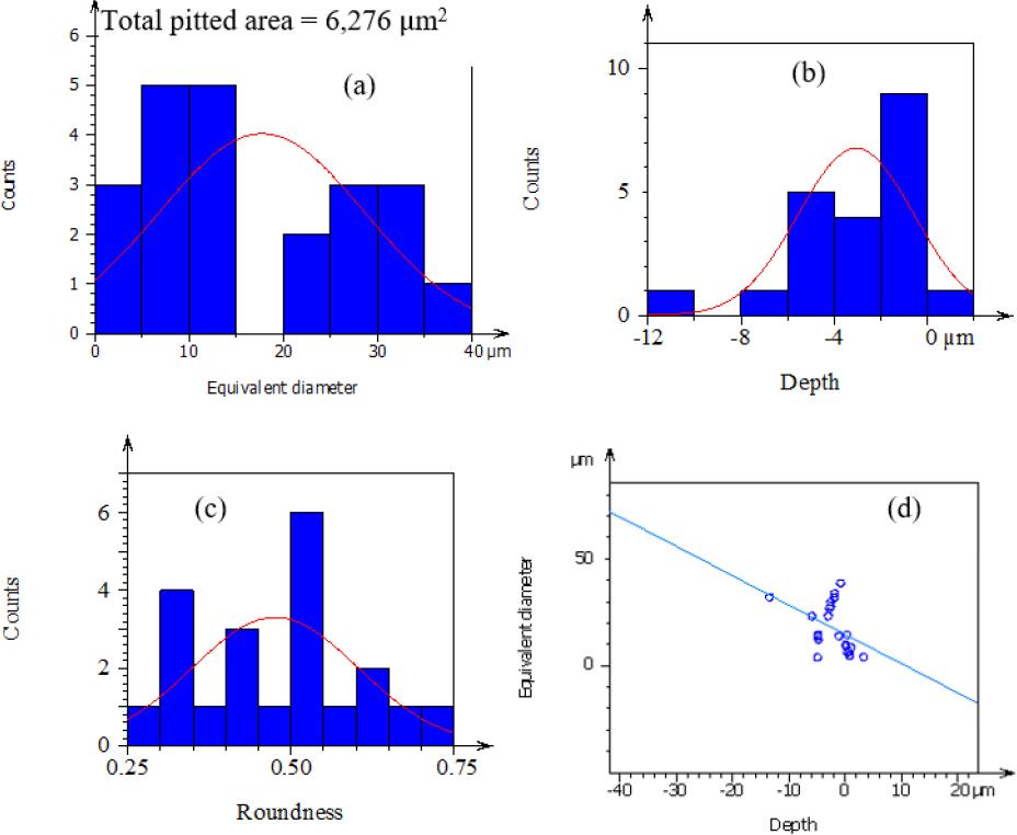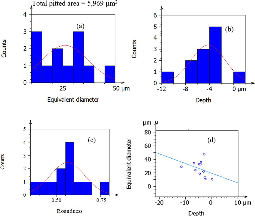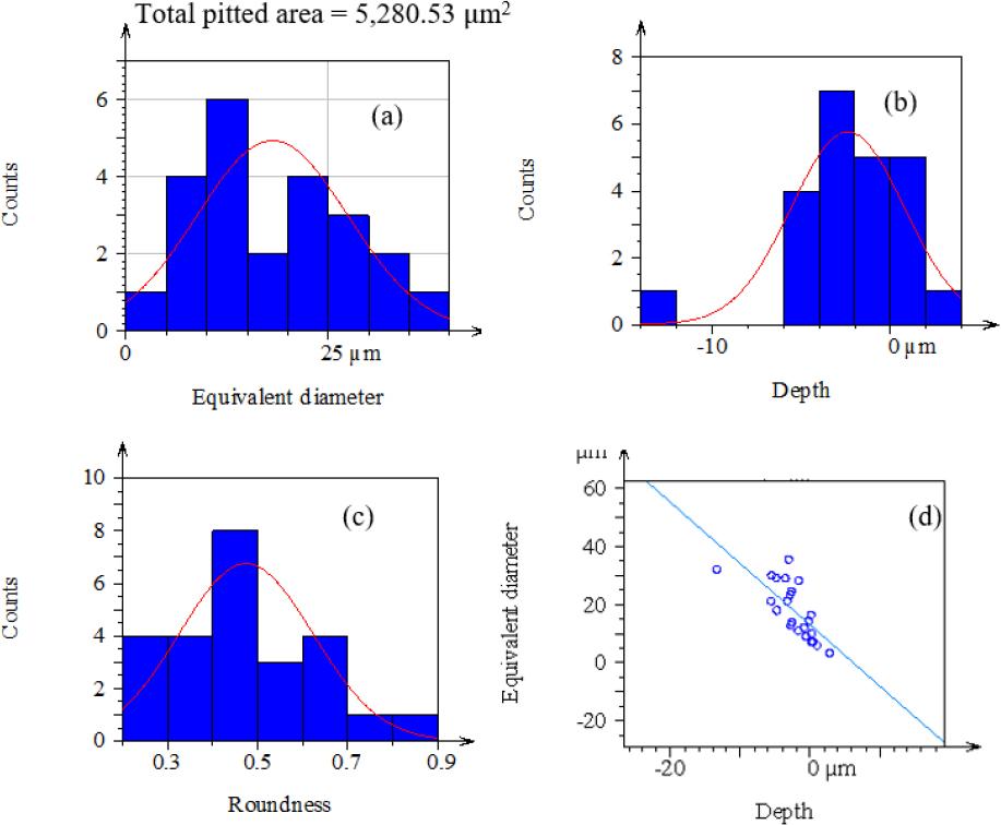 Ni-doped Cr-Mo alloy steel of low-speed micropits (a) equivalent diameter, (b) depth, (c) shape, (d) correlation b/n micropits depth and micropits equivalent diameter