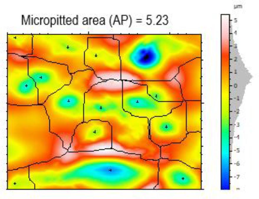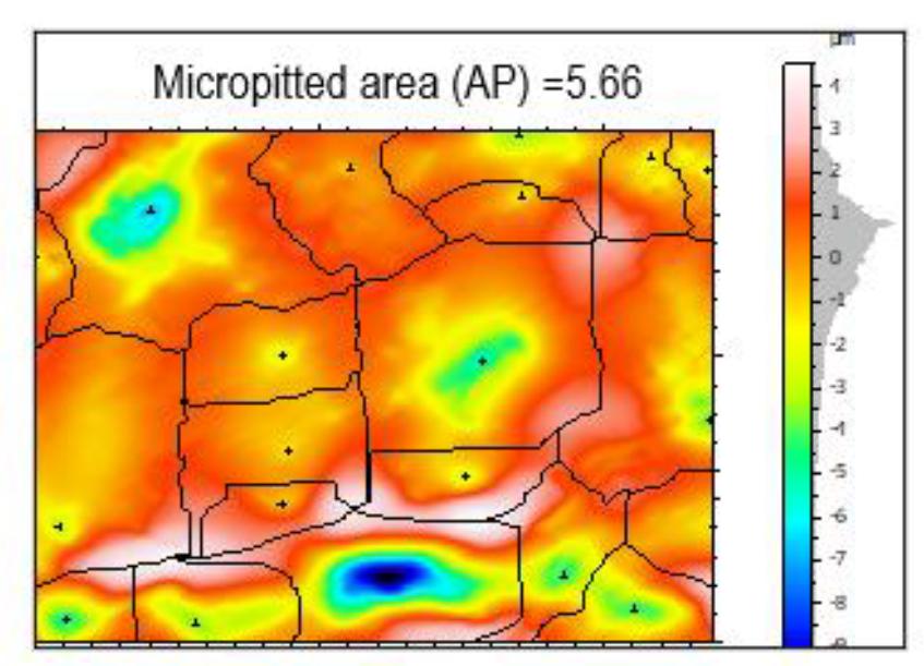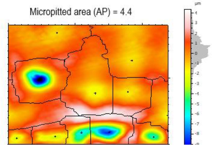 Fig. 13 to 16 show rainbow topography scale photographs, with the blue (watershed segmentation) area representing the pitted area and the reddish area representing the undamaged area. The damage component is given as a percentage of the micro pitting area ratio (AP), which is likewise shown on the upper side of Fig. 13 to 16. The percentage of the Micropitted area can be calculated by dividing the total pitted area by the whole surface scanned by the SEM. The overall picture area for all potential materials is 120,000 μm2. Fig. 14 displays a bigger micropitting area ratio of 5.66%, whereas Fig. 16 shows a lower ratio of 5.23%.