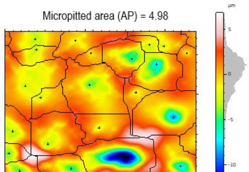 This study uses MountanMap® software to compute micropitting variables like pitted depth, equivalent diameter, and roundness from SEM micrographs. The factors are determined by shifting the micrograph to topography, converting it to a 3D image, and determining pit factors. A micro pit is defined as a surface imperfection with a depth more than 1 μm and a diameter between 10-50 μm below the surface's mean plane [38, 39]. In this study, damaged surfaces with a pitted depth greater than or equal to 1 μm, an equivalent diameter between 10–40 μm are regarded as micropitting. Else if the values are beyond the stated values, it is considered small pitting.