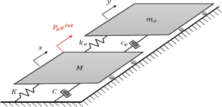 Let us denote the absolute displacements of the masses M and me in the vibrations of the direction of the system by x and y, respectively, while the amplitude and frequency of the excitation force by Po and v (Fig. 2.)