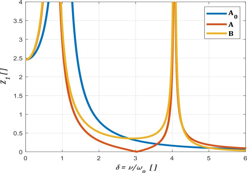 Plot of dimensionless amplitudes z1 for absolute displacements of the protected system A, the vibration eliminator B, and the system without the eliminator Ao, as a function of the ratio δ for the excitation frequency ν to the partial frequency of the eliminator ωn, equal to the antiresonant frequency (10) of the system, where z1 – the ratio of amplitudes to the value of static deflection of the protected mass