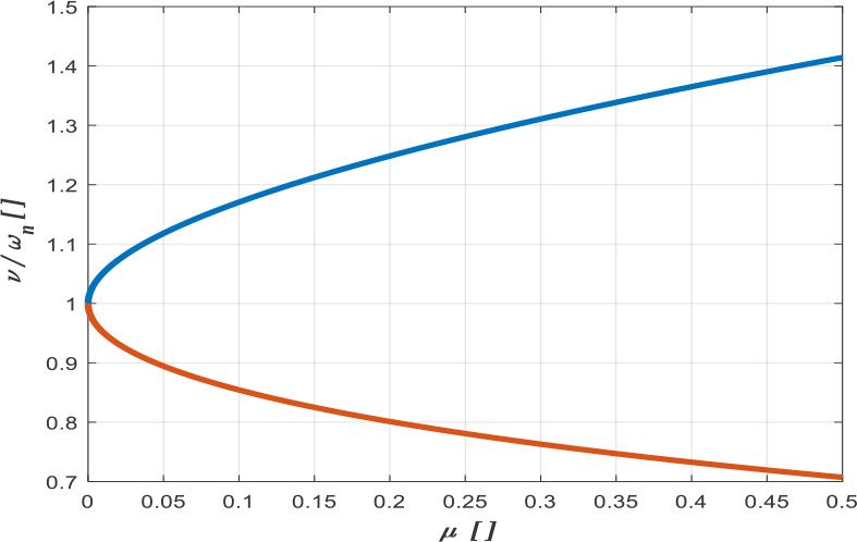 Graph showing the ratio of the resonance frequencies to the antiresonance frequency v/ωn of the analysed system, compared to the ratio of masses me/M = μ in the equality of partial frequencies of the protected and eliminator masses