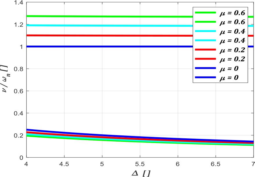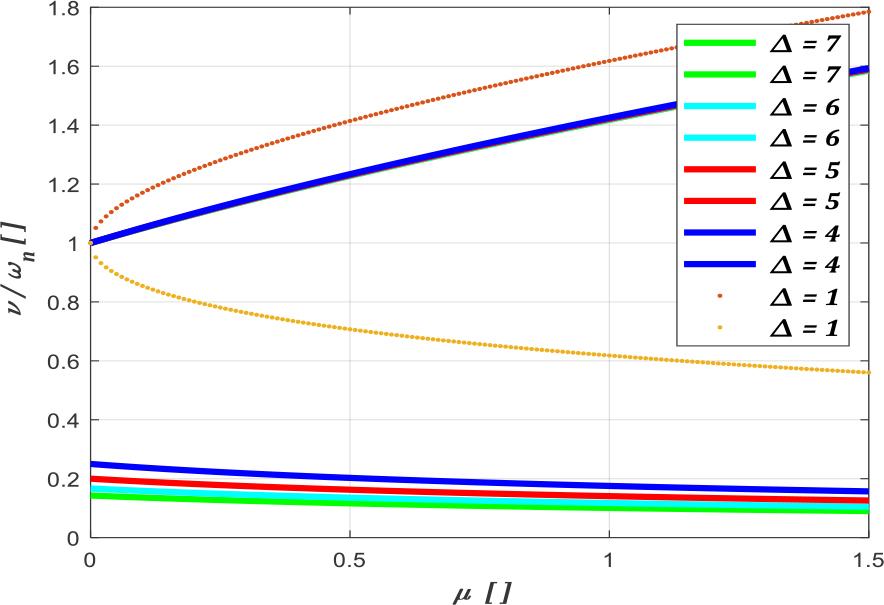 Graphs showing the ratio of the upper and lower resonance frequency to ωn as a function of the mass ratio μ, depending on the value of the parameter Δ. Note: upper frequency graphs for Δ>>1 values (Δ = 4 to 7) coincide approximately on the graph