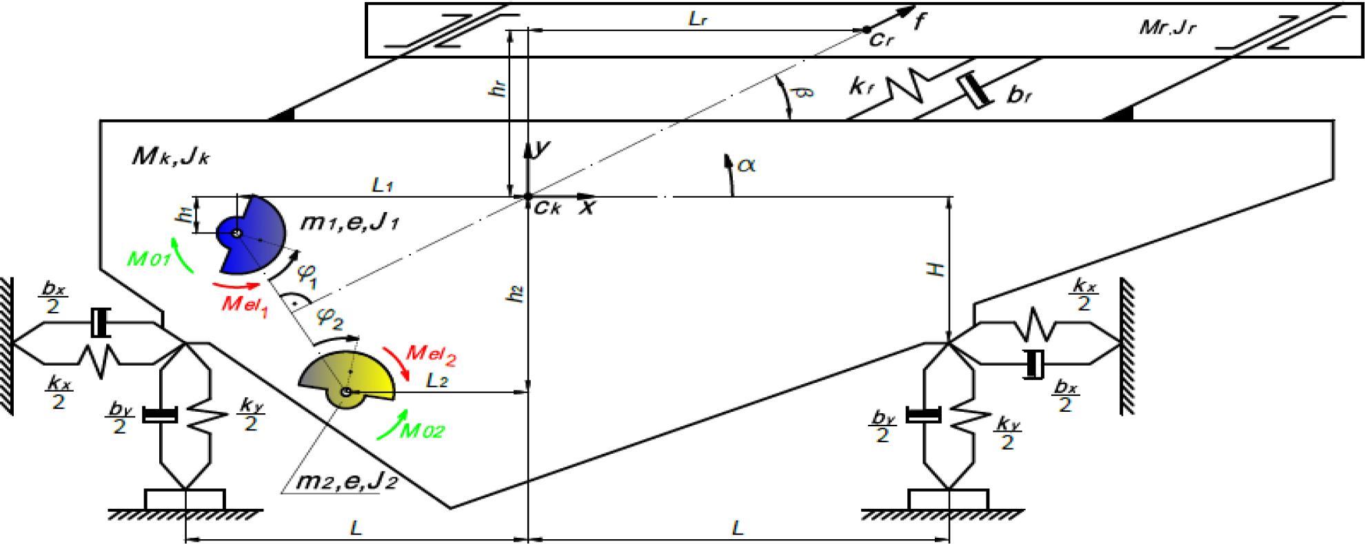 To analyse the motion of the system, in the static equilibrium state of the machine without a feed, an absolute central system was assumed in relation to the body of the machine, with the axes x, y, body rotation angle α, relative displacement of the trough relative to the body f and the absolute angles of rotation of the vibrators φ1 and φ2.