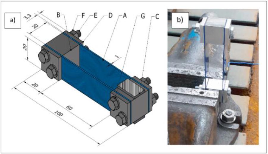 Scheme of the elastic support system, (a) A – flat spring, B – distancing mass, C – mounting washers in the vice jaws, D – pressure plates, E – screws M5x40, F – nuts, G – washers; (b) the system attached to the foundation with a vice