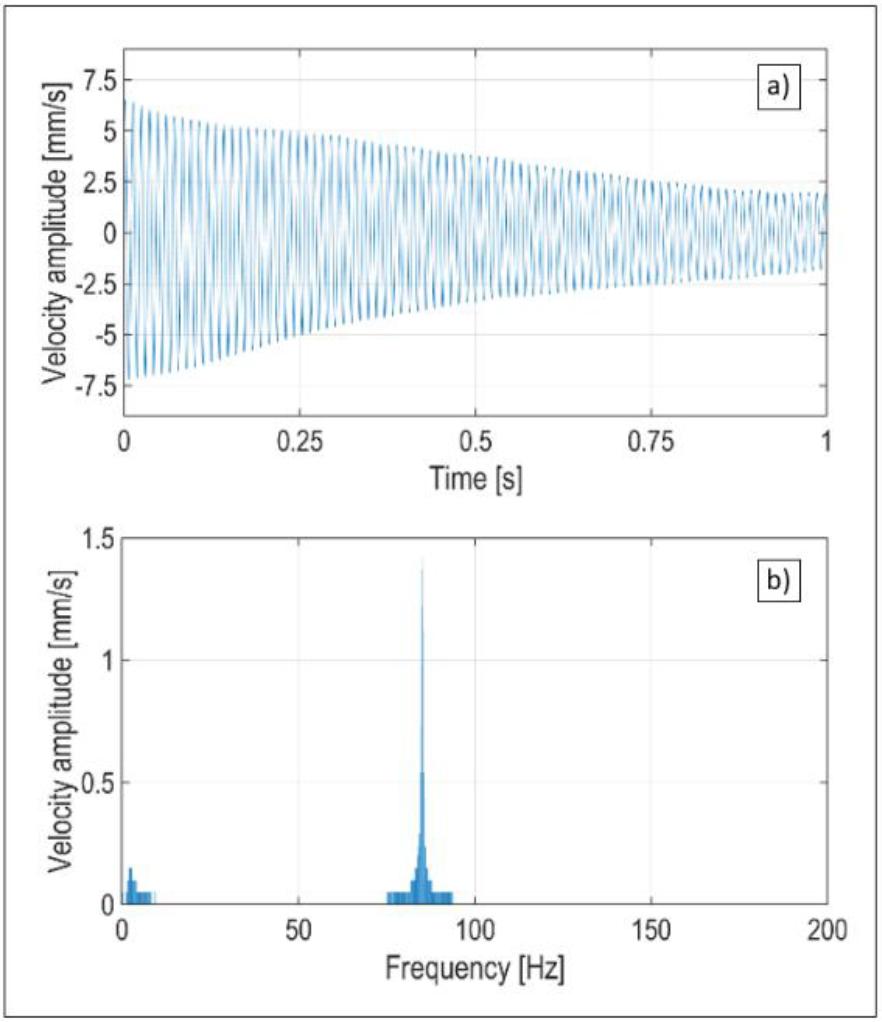 The results of free vibration tests of the system are shown in Fig.10. The time course of the vibration velocity decay is shown in Fig.10a. The results of the FFT analysis are presented on Fig. 10b. The natural frequency obtained from the experiments was 85,3 Hz.