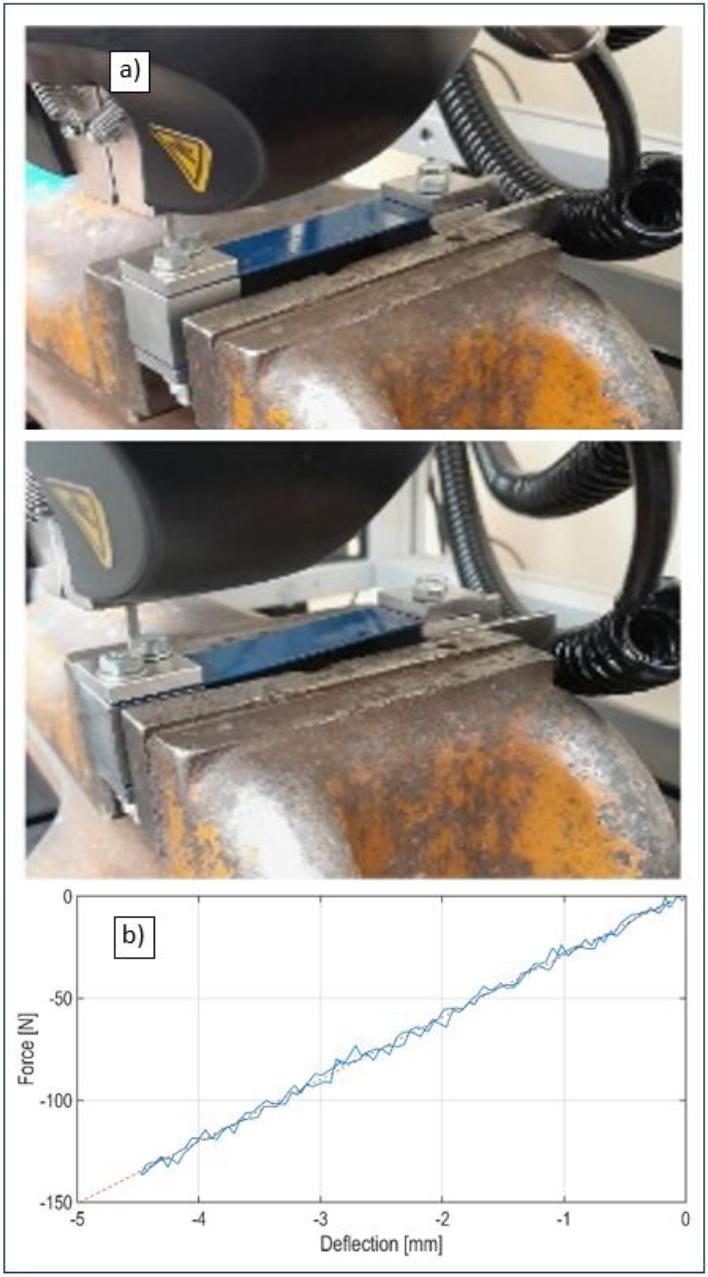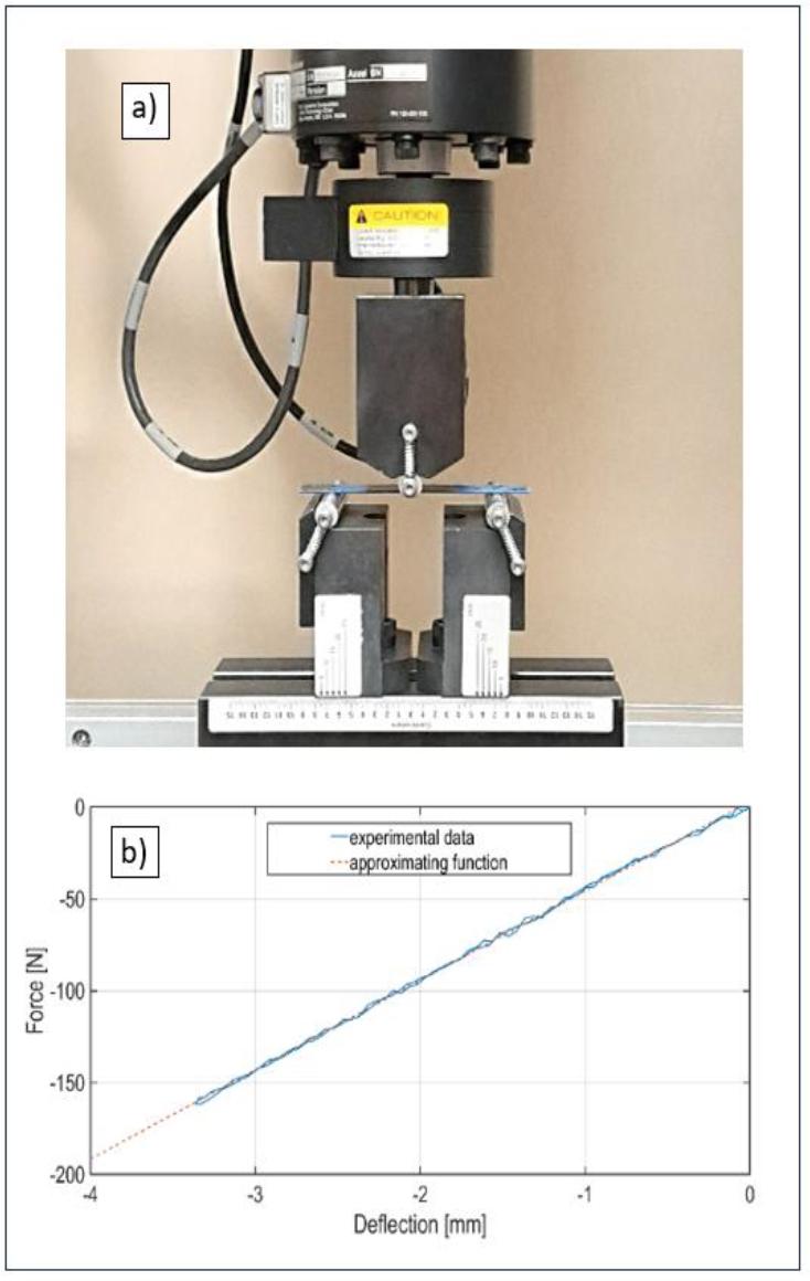 The values of the bending stiffness EJs1 and EJs2 of the used springs and the transverse stiffness kf of the entire system were experimentally tested using the MTS ACUMEN 3 testing machine, equipped with a 250 N force sensor. The traverse shift velocity in all tests was 0.5 mm/s. In the three-point bending flexural tests, the distance between the supports was 70 mm. Figure 11 shows a stand for three-point bending flexural tests and a graph of the lateral force versus the deflection arrow for one of the springs, along with a 1st degree polynomial approximating this course. Approximations of the experimental results were performed in the MATLAB software environment. The values of the slope coefficients of the linear approximating functions were 48.7078 N/mm and 48.4407 N/mm respectively, while the coefficients of determination were 0.9991 R-squared and 0.9992 R-squared respectively. Based on these values and the known relations, the bending stiffness values of the two springs were determined, which were EJs1 = 348058 Nmm2 and EJs2 = 346149 Nmm2 respectively. Figure 12 shows the entire system subjected to transverse load (Fig. 12a) and the relationship between transverse force and stiffness kf of the system along with a function that approximates stiffness (Fig. 12b). The approximate stiffness value was 30.4068 N/mm, with a coefficient of determination of 0.9967.